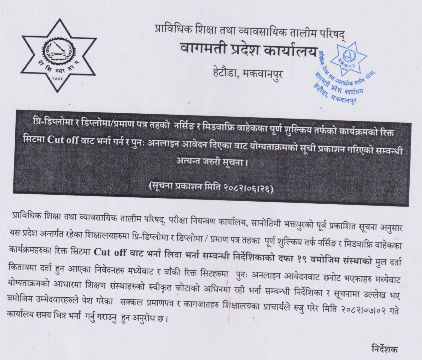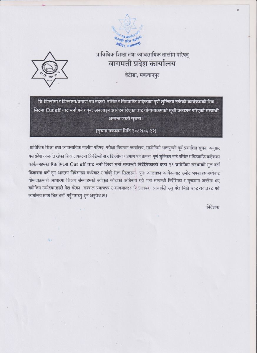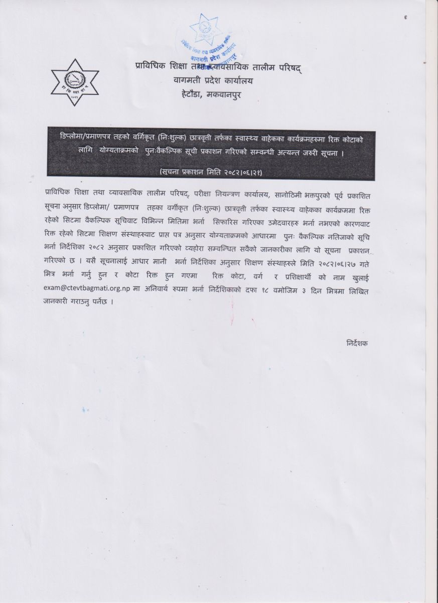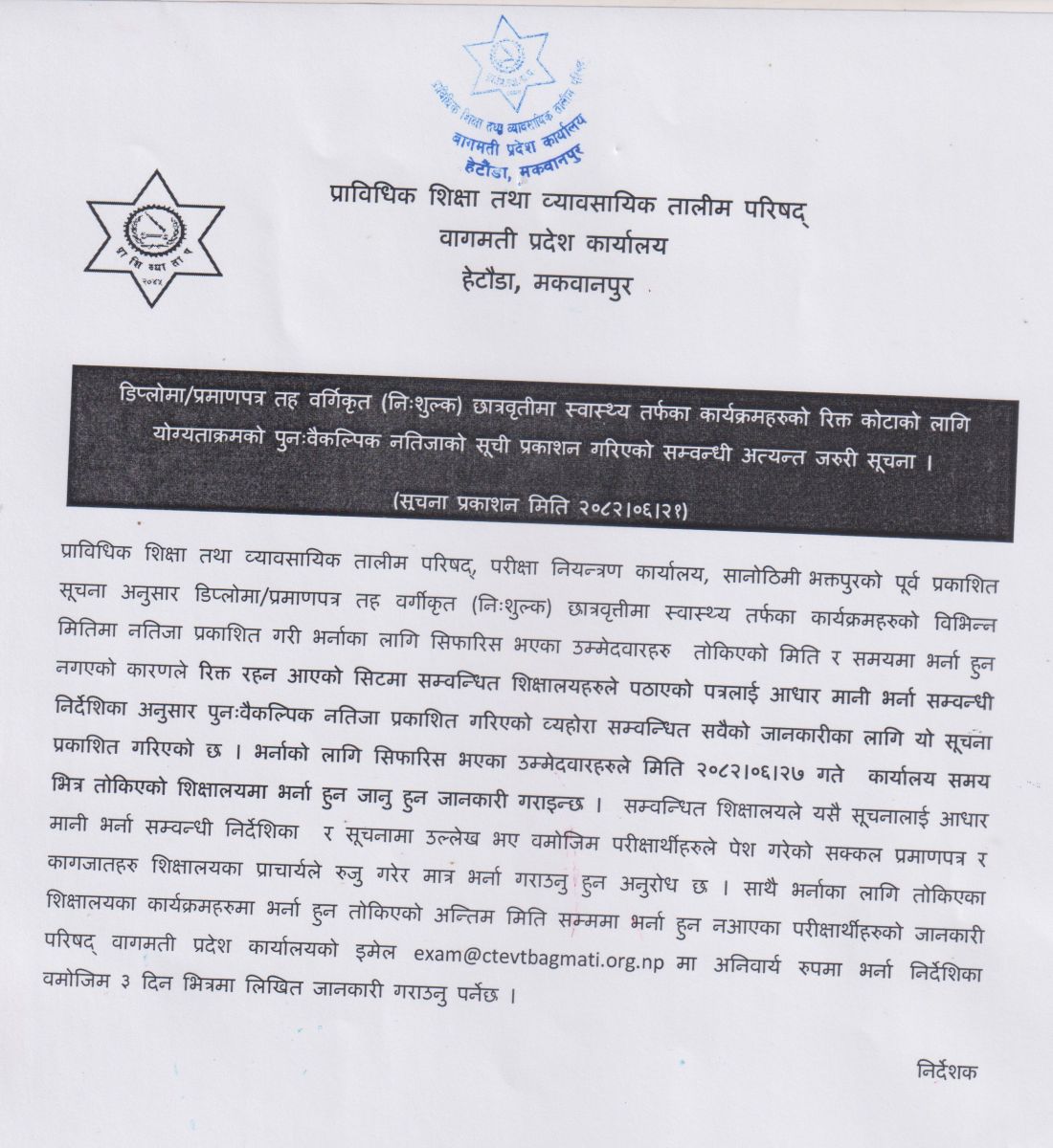 | 2025-09-16 | २०८२-०५-३१ डिप्लोमा स्वास्थ्य बाहेक छात्रवृति तर्फ बैकल्पिक प्रशिक्षार्थी सिफारिस सम्बन्धी सूचना | ||